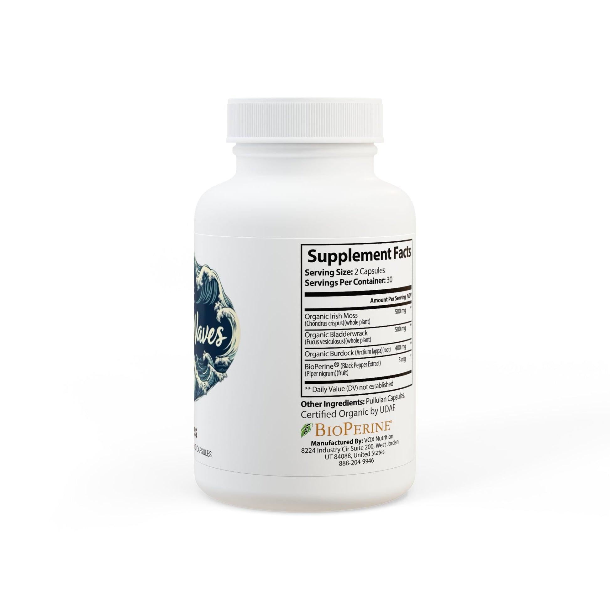 Ingredients: Organic Irish Moss (Chondrus crispus)(whole plant), Organic Burdock (Arctium lappa)(root), Organic Bladderwrack (Fucus vesiculosus)(whole plant), BioPerine® (Black Pepper Extract), (Piper nigrum)(fruit). Other Ingredients: Pullulan Capsules.